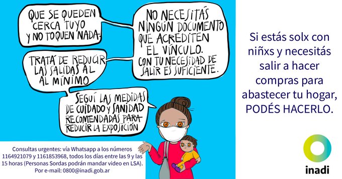 ➡️Madres y padres tienen derecho a salir con su hijx, siempre que no tenga con quién dejarlx y que cumplan con las medidas de cuidado.— INADI (@inadi) April 21, 2020